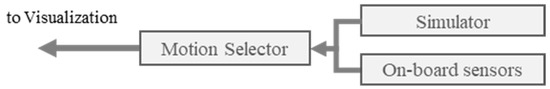 When analyzing incidents in the visualized ACS, information related to the movement of the floating body is also required. In relation to the real-time motion data of a ship, it is necessary to display attitude information from the sensor. Motion data may include the speed and acceleration of the floating body. In addition, a module that generates the motion required for simulation is installed to make the motion of the twin model of the floater. For this purpose, STR’s Deskpilot, a commercial simulator, is connected to the system [12]. Deskpilot is a simulator based on the motion analysis program of Korea research institutes of ships and ocean engineering (KRISO). Various environmental factors, such as waves, winds, and currents, can be changed freely for various types of ships. As used in the actual ship’s automatic identification system (AIS), various sets of sensor information are created according to the NMEA-0183 protocol, which is a protocol defined by the national marine electronics association (NMEA) in the United States since the 1980s, and it is an interface and data communication protocol between marine equipment. Although NMEA 2000 has been distributed, many devices are still communicating based on NMEA-0183, and since it can be applied to NMEA 2000 through a separate converter, the 0183 protocol is applied [13]. The motion selector allows selection between the data from the ship motion simulator and the data from the navigation-related sensors installed on the actual ship. Then, the data are sent to the visualization module and used as information to describe the work condition more precisely. Figure 6 shows the basic function of the motion generator module.