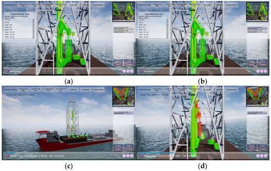 The record of when a collision occurs is displayed on the window, and the process of selecting and reproducing the event is shown in Figure 10. If a collision-related event occurs, workers use the bypass mode in the field to resolve the situation. Separately, the event history is stored in the database. All data are designed to be displayed in the collision alert bar (a). A user using the ACS display system can select and play an event to check from among the events displayed on the collision alert bar (b). At this time, since it is still in the real-time mode, ‘recording’ is shown on the play mode bar. After selecting a playback point, the replay button is pressed to start the replay mode (c). The content of the play mode bar indicates the playback time, which is different from the current system time. By moving the viewpoint during playback, detailed observation of the event is possible (d).
