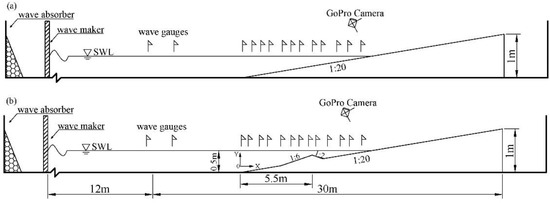 The experiments were conducted in the wave flume located at the Key Laboratory of Ministry of Education for Coastal Disaster and Protection, Hohai University, China. The wave flume has a length of 50 m, a width of 0.5 m, and a height of 1.3 m. The flume is equipped with a hydraulic piston-type wavemaker and an absorbable wave-making mode that can help reduce the influence of secondary reflection waves. Wave absorbers are installed on the flume to mitigate wave reflection. The experimental setup is shown in Figure 1. The experiment’s beach profile contains two types using concrete: plane bed (Figure 1a) and barred bed (Figure 1b). The slope β of both profiles is 1/20. x = 0 is defined at the toe of the beach profile (z = 0). To magnify the effect of the beach profile, a barred beach is designed with steep seaward and shoreward slopes. The bar is located at x = 5.5 m with a seaward slope of 1/6, a shoreward slope of 1/2, a height of 0.4 m, and a triangular shape. The scale of the experimental model is 1:50.