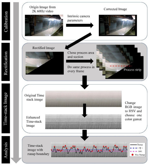 The total methodology of image analysis is summarized as a flow diagram which can be divided into four parts (Figure 2): video calibration, image rectification, time-stack image, and time series analysis. The first two steps (video calibration and image rectification) can be summarized as video measurements.