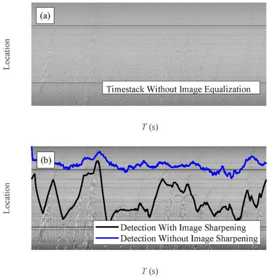 An example application of image sharpening and image equalization. (a) Time-stack image without image equalization. (b) Edge identification comparison between with and without image sharpening, using the time-stack image under image equalization.