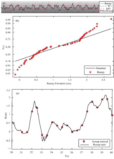 Example of time-stack image: (a) time-stack image with runup edge (black solid line), wave set-up (blue dotted line), SWL (carmine dotted line), and max runup (red star marker); (b) probability cumulative distribution of individual wave runup (red points) and Gaussian distribution (black solid line); (c) automatic wave runup time series compared with a manual process.