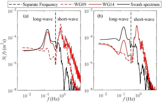 The spectrum of wave and swash motions is obtained using Welch’s method and Hamming’s window. In the wave spectrum, the chosen frequency of separating the short-wave and the long-wave is 0.5/fp [38].
