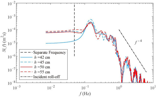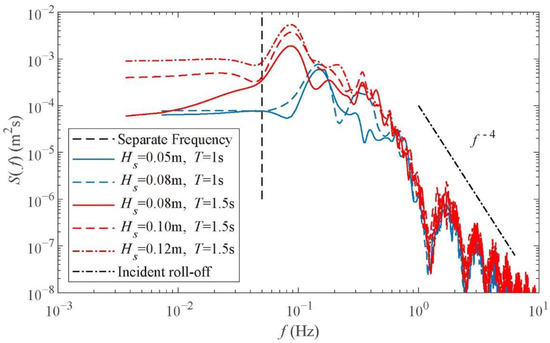 To analyze wave condition effects on the swash spectrum, incident wave periods and heights are considered. With the same beach profile and water depth in the experiments (Figure 9), peak frequency varies under different incident wave periods. With a large incident wave period, the swash spectrum has a minor peak frequency but large peak energy in the incident band. The incident wave period does not affect the roll-off of the incident swash band (f−4).