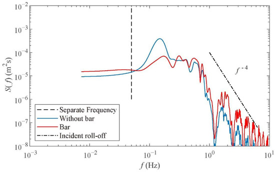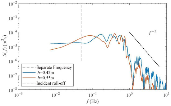 Swash spectra on the plane beach and barred beach are compared under the same experiment condition (Figure 10). On barred beach swash, the roll-off f−4 seems inappropriate (red solid line). Combined with Figure 8, the incident swash roll-off is affected by beach profiles. In the plane beach experiments, roll-off is f−4, while on the barred beach, roll-off is f−3 which is similar to a dissipative beach.
