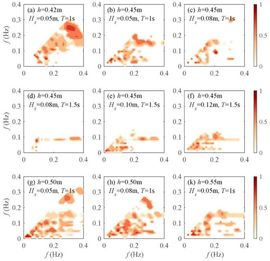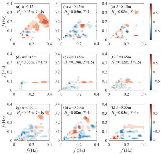 Bispectral analysis provides more details on the effects of water depth. Bicoherence results are used to find out whether swash exchanges energy between two energy bands (Figure 11). With the same wave condition (Figure 11a,b,g,k), a max value b(0.1, 0.03) exists, indicating an energy connection between infragravity and an incident band under different water depths in the experiments. With the increase of water depth, the frequency coupling in the bicoherence becomes lower. The degree of energy exchange in the imagery part is similar to the results of bicoherence (Figure 12). Incident swash energy mainly transfers to a higher frequency when the frequency is larger than 0.2 Hz (Figure 12a,b,g,k). Under the shallow water depth (h = 42 cm), a more obvious coupling band can be found in the bicoherence. An energy connection within the incident swash band is also observed in Figure 11a. In an interesting pattern, frequencies of 0.04 Hz and 0.1 Hz have an energy input from 0.14 Hz, which is mainly found in shallow water depths (Figure 12a). Under larger water depths, the direction of energy transformation is low frequency to high frequency (Figure 12b,g,h). Therefore, the shallow water depth (h = 42 cm) results in the infragravity band decrease in Figure 7.