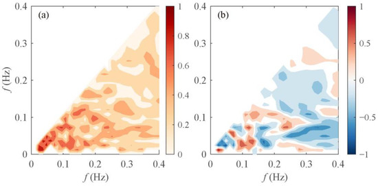 Bispectral analysis is widely used in the analysis of energy transfer between different frequencies in swash, nonlinear waves, and infragravity waves [43,44,45]. Bispectral analysis provides more evidence on energy response and transformation in the swash zone. Bryan and Coco [35] suggested that the interesting pattern of swash bispectrum lies in the band (f/2, f/2). The wavelet-based bispectrum used here is based on van Milligen et al. [46]. The bispectrum measures the phase coupling between three wavelet components of frequency. Bicoherence is the normalized bispectrum and is a measure of the amount of phase coupling between two signals or in a signal (Figure 11). The value of bicoherence ranges from 0 to 1, representing the degree of wave phase coupling and denoting a maximal coupling [46]. The imagery part of the bispectrum is used to determine the direction of swash energy transformation (Figure 12). Color intensity is the magnitude of energy transfer and also denotes the energy transformation direction. Positive values of the imagery part indicate energy transfer from f1, f2 to f3 (f3 = f1 + f2) while negative values represent the opposite.