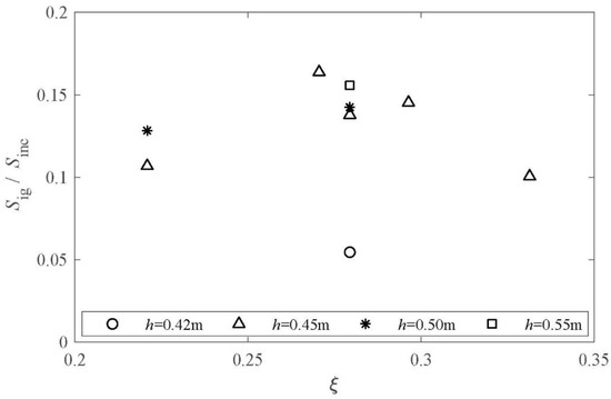 The infragravity band has been demonstrated to contribute to the total swash height under varying beach slopes. A possible relationship between the surf similarity parameter and significant swash height ratio of the two bands is visualized (Figure 14). Figure 14 shows that in the same wave condition (ξ = 0.279 and 0.221, dissipative), the ratio of infragravity and the incident band swash height increase with the increasing experimental water depth. The increase of experimental water depth leads to more energy in the infragravity band, just the same as the results shown in Figure 7. Meanwhile, with the same water depth in the experiments (same marker in Figure 14), the proportion of swash height Sig/Sinc first increases and then decreases with increasing surf similarity. The increasing trend of Sig/Sinc demonstrates that the ratio of incident and infragravity swash energy on the reflective beach is greatly lower than those on the dissipative beach.
