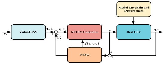The feedback value of the underactuated USV system states obtained by NESO has been mentioned before. After redefining the error model, the sliding mode surface is designed for controller design. The control scheme structure diagram is shown in Figure 4.