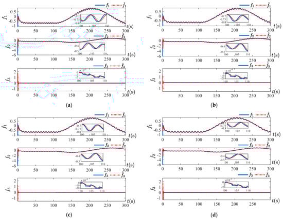 Figure 5 shows the tracking curves of the complex disturbances for four periods under the disturbances of Equation (37). The complex disturbances are related to the USV’s own velocity, position information and external environmental disturbances, which are non-periodic disturbances. The red curve, which is the observed value, is very close to the actual value (the blue curve), as can be seen in the figures below.