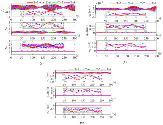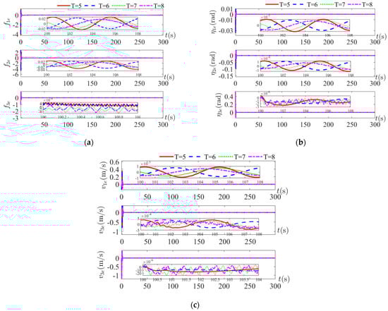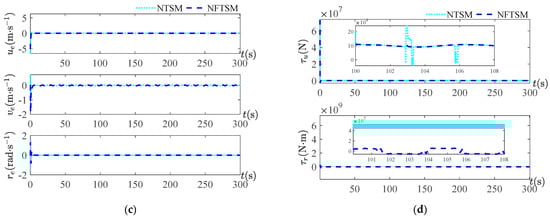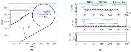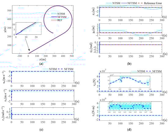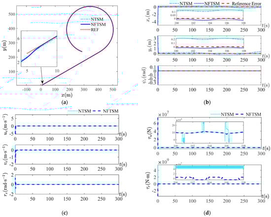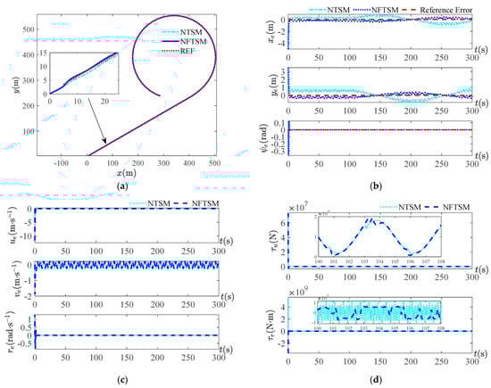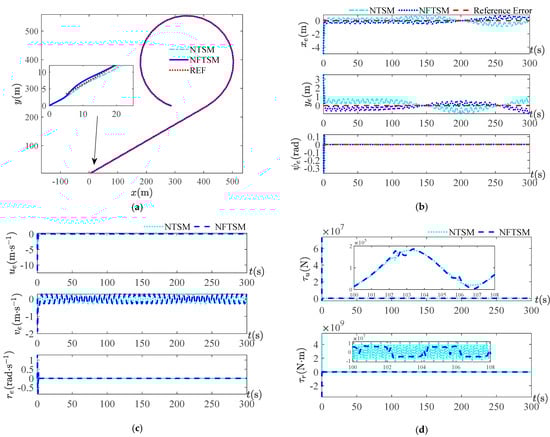 Figure 7, Figure 8, Figure 9 and Figure 10 show the simulation results under four periods of disturbance . The trajectory tracking curve, position tracking error curve, velocity tracking error curve and surge force and yaw moment curve are given for each period. For the trajectory tracking curves under four periods, it can be seen that, overall, both control methods can track the reference trajectory, but from the local zoom in, it can be seen that the NFTSM control method used in this study approaches the reference trajectory earlier than the NTSM method and the approximation error is smaller. The small error indicates that the safety is higher and the risk is lower when performing the task using this method. As seen from the velocity tracking error curve, there is not much difference between the two methods because, overall, both methods can make the USV track on the reference trajectory, while achieving the position tracking needs to satisfy the velocity tracking first. For the simulation curves of surge force and yaw moment, it can be seen that the output curve of the controller is smoother than the control method used in this study, and the output curve of the NTSM control method is more strongly chattered. When the periods are and , it is obvious from the position tracking Figure 9b and Figure 10b under the two sets of periods that the control method NFTSM of this paper is better than the NTSM control scheme.
