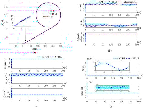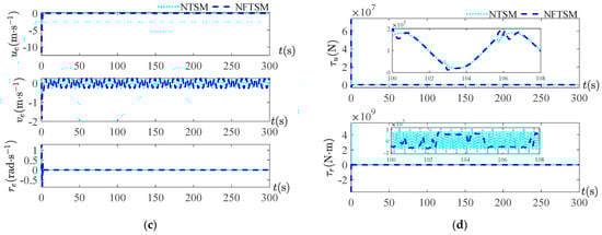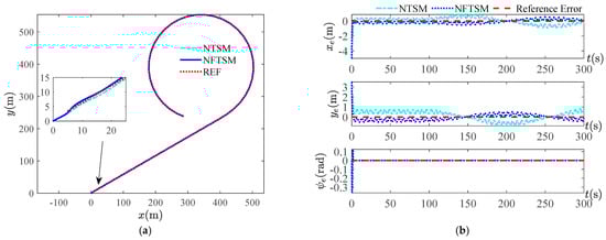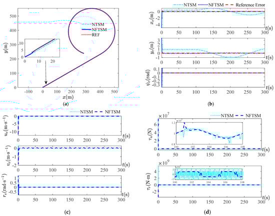 The simulation results shown in Figure 12, Figure 13, Figure 14 and Figure 15 are obtained by varying the period of the disturbances. Since the disturbances amplitude is 10 times the disturbances in Equation (37), the errors of the observed value obtained by NESO are relatively large compared to the small amplitude disturbances, which have an impact on the position tracking results and lead to a larger error. In the presence of observation errors, both control methods can achieve trajectory tracking control as seen in the trajectory tracking result graph, but the control effects are different. From the simulation results of Figure 12 at the disturbance period of , it is obvious from Figure 12b that the control effect of the blue curve NFTSM of the control method used in this paper has a smaller error, and Figure 12d shows that the chattering of the yaw moment is smaller. When the period becomes larger, as seen from the position error curves of the four periods, the tracking error of the control method in this paper is smaller, and its error curves are closer to the reference error curve of zero value. The simulation graph of the yaw moment at four periods shows that the control scheme proposed in this study has a smaller frequency of control output variation and less chattering.