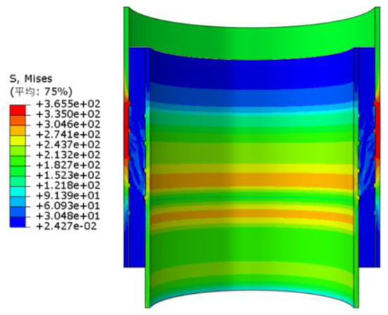 It indicates in Figure 13a,b that Mises stress on the tension side of the inner pipe is greater than that on the compression side, especially the stress at the shear keys. Stress concentration is obvious at the position of the shear bond. The Mises stress in the inner pipe is gradually reduced from the first shear key at the upper end to the lower end of the joint. It shows at the Figure 13c,d that the regularities of stress distribution in the outer pipe are opposite to that of the inner pipe. The Mises stress of the outer pipe is mainly concentrated in the shear bond position of the lower part, which gradually increases from the first shear bond at the uper position to the last one at the bottom. As the height of shear keys increased from 10 mm to 60 mm, Mises stress and its distribution did not change significantly at both sides of the pipes.