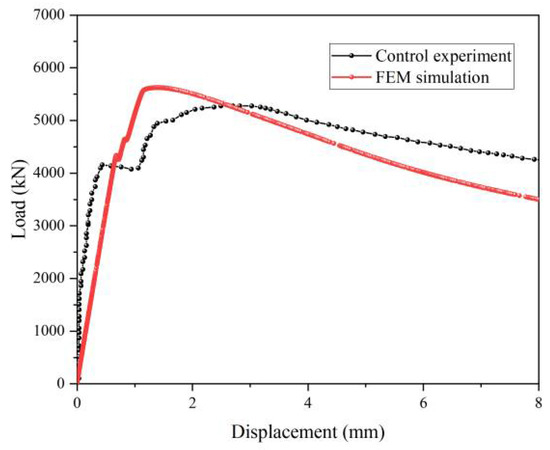 In order to verify the effectiveness of the numerical simulation method for grouted joints, an FE model is established referencing Lee’s experiment [22]. The size, material properties and loading mode are all corresponding to the grouted joints in the test. The numerical simulations are highly consistent with the experimental results, as shown in Figure 5 and Figure 6. The overall trend of the curves is generally consistent. The peak load of the FE model is 5623 kN, and that of the test is 5394 kN. The error is 4.2%, which is within the acceptable range. It shows that the modeling and numerical simulation method are reliable.