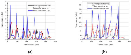 Under a specified axial load, shear keys with different shapes lead to different stresses in the grout. So, the Tresca stress is applied to judge whether a shear key of a certain shape is appropriate or not. According to the numerical simulation results, the Tresca stresses of the grout close to the internal and external steel walls are extracted, and the axial distribution of the Tresca stress is shown in Figure 9.