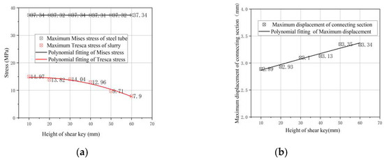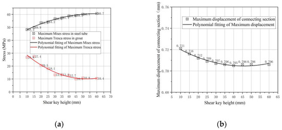 The variation of maximum stress/displacement of steel pipes and grout with rectangular shear keys in different heights is shown in Figure 10.