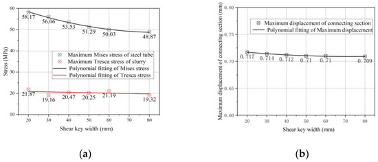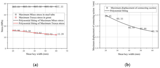 Considering the influence of shear key width on the bending bearing capacity, different widths are adopted. The variation of maximum stress and maximum horizontal displacement of the grouted joints under bending moment is shown in Figure 15.