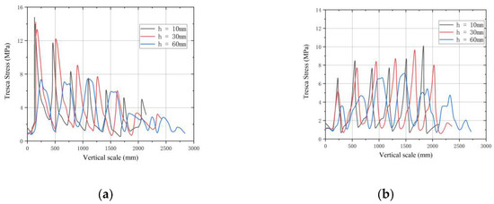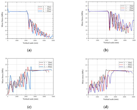 The Mises stresses vertically along the steel pipe with shear keys’ heights of 10 mm, 30 mm and 60 mm are extracted, as shown in Figure 13.