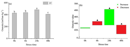 The change trend of osmotic pressure in the HT group was first increased and then decreased. This was because the fish maintained its own pressure by regulating its own osmotic pressure to regulate the concentration of ions after stress. The research showed that [35] the effect of environmental temperature stress on juvenile catfish plasma ion concentration and osmotic pressure concentration, and found that Na+, Cl− and osmotic pressure showed an upward trend, while K+ remained roughly unchanged. The results of Na+, Cl−, and osmotic stress were similar to those of this study, but K+ was different. It is found that the ionic permeability increases [36] when the temperature rises, so Na+, Cl−, and osmotic pressure show an upward trend. The change in K+ concentration may be due to the fact that after the increase in cell membrane permeability, K+ needs to enter the cell to play a balancing role, leading to the decrease in the concentration. The Na+ and Cl− concentration change at 48 h, which may be due to the balance of K+.