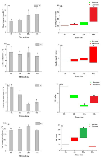 Changes in osmotic pressure (a), osmotic pressure value (b), blood glucose (c), blood glucose value (d), lactic acid (e), lactic acid value (f), K+ concentration (g), K+ value (h), Na+ concentration (i), Na+ value (j), Cl− concentration (k) and Cl− value (l) in the serum of young yellowfin tuna under acute high–temperature stress. The value is the gap of the experimental group minus the control group. Red means down and green means up. The significantly different between the control group and the HT group was represented by a ▲. Different and the same letters indicate a significant difference (p < 0.05) and insignificant difference (p > 0.05).