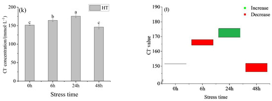 The K+ concentration in the HT group (Figure 1g) showed a trend of first decreasing and then increasing with the prolongation of time. There was no significant difference between 0 h and 6 h, 24 h, and 48 h. At 48 h, K+ in the HT group was lower than in the control group and higher than in the control group at other time points (Figure 1h). The concentration of Na+ and Cl− increased first and then decreased with the extension of stress time, with the same trend, and reached the peak at 24 h. Na+ concentration in the HT group (Figure 1i) had significant differences at 6 h, 24 h, and 48 h. At 24 h, the Na+ concentration in the HT group was higher than that in the control group and lower than that in the control group at other times (Figure 1j). The concentration of Cl− in the HT group (Figure 1k) was significantly different between adjacent groups. At 24 h, the Cl− concentration in the HT group was higher than that in the control group and lower than that in the control group at other times (Figure 1l). The concentration order of three ions in each group was Na+ > Cl− > K+.