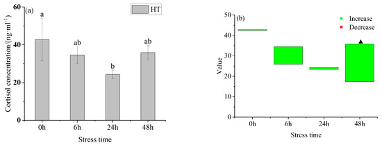 Changes of serum cortisol (a) and cortisol value (b) in young yellowfin tuna under acute high-temperature stress. The value is the gap of the experimental group minus the control group. Red means down and green means up. The significantly different between the control group and the HT group was represented by a ▲. Different and the same letters indicate a significant difference (p < 0.05) and insignificant difference (p > 0.05).