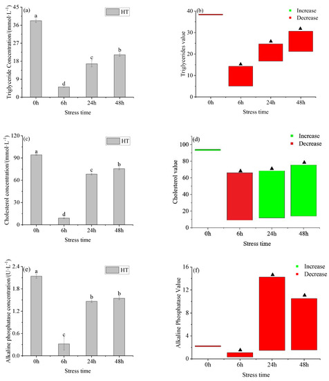 The serum triglyceride and cholesterol concentration in the HT group (Figure 3a,c) showed a trend of first decreasing and then increasing with time, there were significant differences between the groups. The concentration of serum triglycerides in the HT group was lower than the corresponding concentration in the control group at four times point (Figure 3b). There was no significant difference between the HT group and the control group at 0 h, but there were significant differences at the other points. The cholesterol concentration in the HT group was lower than the control group at 6 h and higher than at the other points (Figure 3d). There was no significant difference in serum cholesterol concentration between the HT group and 28 °C at 0 h, but there was a significant difference between 6 h, 24 h, and 48 h. The activity of alkaline phosphatase in the serum of the HT group (Figure 3e) showed a trend of first decreasing and then increasing. The lowest value was reached at 6 h, and it reached to gradually stable after 6 h. The activity of alkaline phosphatase of the HT group was higher than the control group all the time. There was no significant difference in serum alkaline phosphatase concentration between the HT group and the control group at 0 h, but there was a significant difference at the other times point.