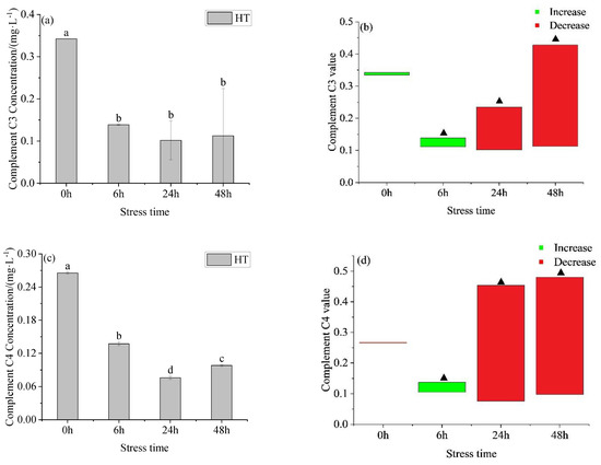 Changes in complement C3 concentration (a), C3 value (b), complement C4 concentration (c) and C3 value (d) in serum of young yellowfin tuna under acute high–temperature stress. The value is the gap of the experimental group minus the control group. Red means down and green means up. The significantly different between the control group and the HT group was represented by a ▲. Different and the same letters indicate a significant difference (p < 0.05) and insignificant difference (p > 0.05).