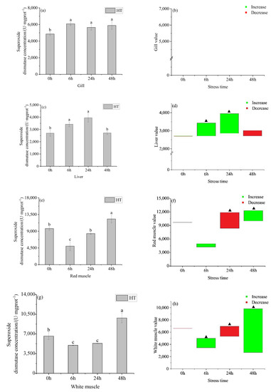Changes in gill superoxide dismutase (SOD) (a), gill SOD value (b), liver SOD (c), liver SOD value (d), red muscle SOD (e), red muscle SOD value (f), white muscle SOD (g) and white muscle SOD value (h) in organs of young yellowfin tuna under acute high–temperature stress. The value is the gap of the experimental group minus the control group. Red means down and green means up. The significantly different between the control group and the HT group was represented by a ▲. Different and the same letters indicate a significant difference (p < 0.05) and insignificant difference (p > 0.05).