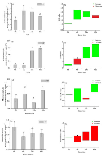 Changes in gill malondialdehyde (MDA) (a), gill MDA value (b), liver MDA (c), liver MDA value (d), red muscle MDA (e), red muscle MDA value (f), white muscle MDA (g) and white muscle MDA value (h) in organs of young yellowfin tuna under acute high–temperature stress. The value is the gap of the experimental group minus the control group. Red means down and green means up. The significantly different between the control group and the HT group was represented by a ▲. Different and the same letters indicate a significant difference (p < 0.05) and insignificant difference (p > 0.05).