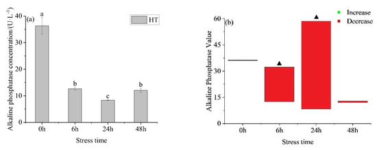 Changes in alkaline phosphatase (a) and alkaline phosphatase value (b) in the liver of young yellowfin tuna under acute high–temperature stress. The value is the gap of the experimental group minus the control group. Red means down and green means up. The significantly different between the control group and the HT group was represented by a ▲. Different and the same letters indicate a significant difference (p < 0.05) and insignificant difference (p > 0.05).
