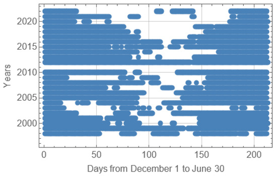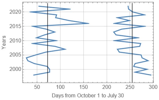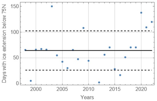 Broken lines in Figure 4 show the dates when sea ice was observed near Hopen Island in the first time (left line) and in the last time (right line) during ice seasons in 1998–2022. Straight lines show the mean dates of the beginning (December 11) and the end (June 11) of the ice seasons. It is possible to see a shortening of ice seasons from 1998 to 2017 and an extension of ice seasons after 2017. The mean duration of the ice seasons near Hopen Island (ADH) is 181 days. Standard deviations of the beginnings and the ends of the ice seasons are, respectively, 32 days and 25 days. Thus, ADH is three times greater than AD75.
