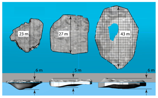 Drift ice observed along Spitsbergen Bank during the cruises consisted of relatively big areas with slushy ice, sea ice floes with a thickness of 30–40 cm, and diameters 10–100 m; consolidated sea ice floes with mean drafts 4–6 m and diameters 20–50 m; and bergy bits [16]. In 2019, fieldwork was performed on the consolidated floe with draft up to 9 m [3]. Thick consolidated floes were found in each of the cruises. Their occurrences were not rare events. Nevertheless, the number of consolidated floes was smaller than the number of floes with 30–40 cm in thickness. Laser scanning and drilling studies were performed to investigate the structure and shape of the thick floes [16]. Examples of computational models of three floes investigated in 2017 and 2018 are shown in Figure 7. One can see that all floes have smoothed shapes and maximal thickness of 5–6 m. Thick consolidated floes consisting of the first-year sea ice were recognized as completely consolidated ice ridges [3]. We did not observe strong interactions of floes along Spitsbergen Bank and assumed that the observed consolidated ice ridges formed in some other places.