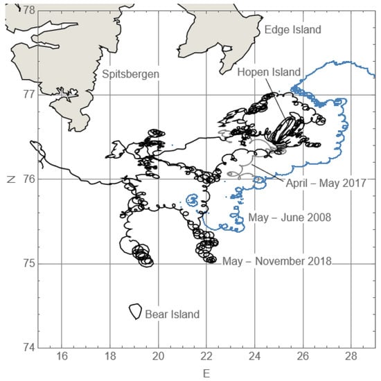 Figure 8 shows trajectories of three drifting buoys (Oceanetic Measurements Ltd., North Saanich, BC, Canada) deployed on sea ice along Spitsbergen Bank in 2008, 2017, and 2018. After the ice melt, the buoys survived and transmitted the data as trackers of surface currents. The GPS data were transmitted with 15-min sampling intervals via Iridium. The buoy trajectories consist of many loops passed by the buoys in a clockwise direction [17,18]. The clockwise motion of water and sea ice with a semidiurnal period are forced in the region by the semidiurnal tide [19]. The motion of drifting ice along Spitsbergen Bank can be considered as a free drift with significant shear deformations [20]. The shear deformations are explained by the actions of strong tidal currents in combination with wind and swell drags. Depending on the wind conditions, some of the buoys deployed along Spitsbergen Bank drifted in the region over several months (see the trajectory of the buoy deployed in 2018 in Figure 8), while other buoys left the region in a few weeks [20].