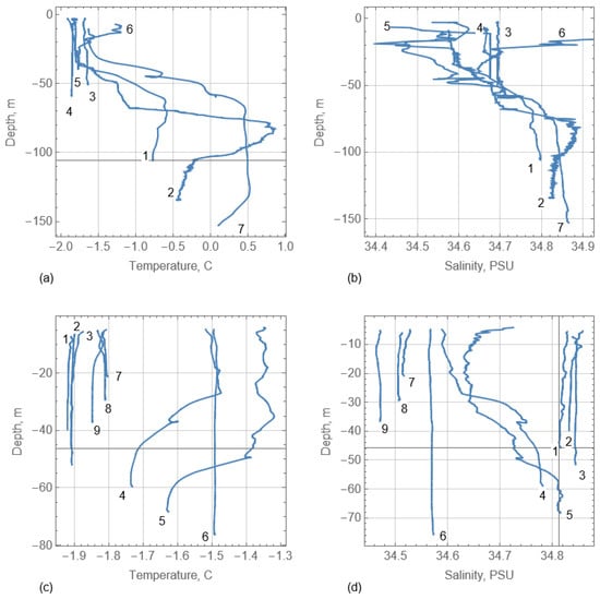 The temperature and salinity measurements were performed by CTD profiling with SBE-19 in April 2017–2019 from drifting floes and from the board of the “Polarsyssel”. Locations, dates, and times of CTD profiling in 2017 and 2018 are shown in Figure 5 by points 1–7, and the times of the measurements are specified in Table 1. Vertical profiles of temperature and salinity measured in 2017 and 2018 are shown, respectively, in Figure 9a–d. In 2017, the CTD profiles in points 1 and 2 were measured from the floe, and the CTD profiles in points 3–7 were measured from the board of the “Polarsyssel” when she was moored and drifted together with a floe on 24–26 April near the point (23° E, 76.5° N). Then, the vessel crossed Spitsbergen Bank for visual observations of the ice conditions and CTD profiling in points 3–6 and returned to point 7 located near points 1 and 2 (Figure 5). The CTD profiles 1, 2, and 7 were performed almost in the same place near the tip of Store Fjord Trough but at different times. They demonstrate the strong spatial and temporal variability of the water characteristics in this place. The water characteristics at depths below 70 m are close to the characteristics of the “ideal” Atlantic water, and the water characteristics above this level are close to the Polar Front water, which is saltier than Arctic water but colder than Atlantic water [23,24,25].
