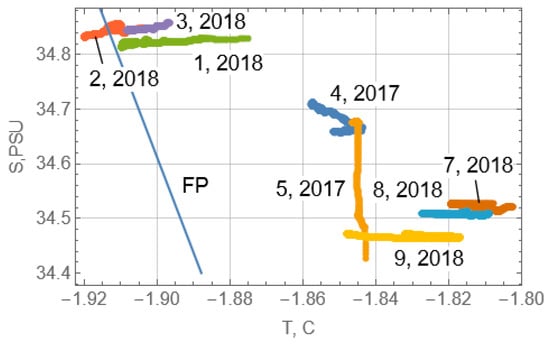 In 2018, CTD profiles 1–9 were performed from the ice floes or from the board of the “Polarsyssel” moored to the floes. Profiles 1–5 and 6–9 were recorded when the vessel was moored to the middle and right floes shown in Figure 7, respectively. Profiles 1–3 were performed in the depth range 40–50 m, profiles 4–6 were performed in the depth range 60–80 m, and profiles 7–9 were performed in the depth range 20–40 m in the shallowest part of Spitsbergen Bank. The salinity above 34.8 PSU supports to consider this water as cooled Atlantic water. Profiles 4–6 correspond to the Polar Front water. The salinity is approximately 34.5 PSU, and the temperature is around −1.8 °C on profiles 7–9. Their characteristics are close to the “ideal” Arctic water.
