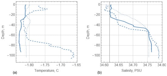 In 25–27 April 2019, all CTD profiles were performed from the “Polarsyssel” with a cast interval of one hour. The measurements were located over the bottom slope of Hopen Island at a distance 30 km from the island over a depth of 98–110 m (Figure 5). The ship drifted near consolidated floe with 9 m of draft, where the fieldwork was performed by moto-boats. Examples of temperature and salinity profiles from 25 to 27 April 2019 are shown in Figure 11. We note strong time variations in the vertical profiles associated with the internal waves of the semidiurnal period [30]. The water temperature within the water column changed between −1.83 °C and −1.65 °C, and the salinity changed between 34.6 PSU and 34.8 PSU. These characteristics indicates Polar Front water [31].