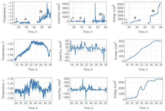 Figure 12 shows the recorded temperature below the ice (left panel), calculated ocean heat flux (middle panel), and cumulative heat flux (energy) versus time. The mean heat fluxes during three stages of measurements in 2017 were estimated as 12.7 W/m2, 19.5 W/m2, and 91.1 W/m2. The increase in the heat flux on the third stage is explained by the increase of the water temperature from −1.8 °C to −1.2 °C (Figure 11, left graph in the top panel). In 2018 and 2019, the mean heat fluxes were 15.2 W/m2 and 27.3 W/m2, respectively.