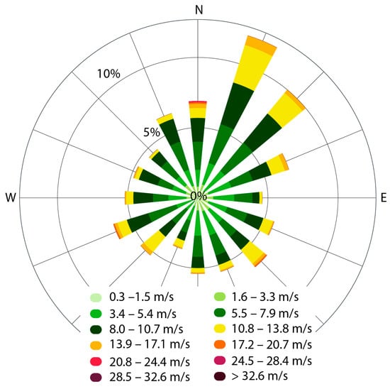 Wind rise constructed with weather data from the meteorological station on Bear Island is shown in Figure 13 for the period from October 2018 to June 2019. Wind rise constructed for the same period in 2016–2017 and 2017–2018 was very similar. Dominant winds from north–Northeast influence ice drift to Bear Island. The probability of other wind directions is lower than 5%, and it is distributed uniformly over the azimuthal angle. Highest wind speed below 20 m/s is also distributed uniformly over the azimuthal angle. Wind drags supports the general direction of ice drift to Spitsbergen Bank from the northeast. At the same time, winds of other directions influence regular displacements of ice from Spitsbergen Bank in different directions.