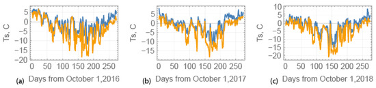 Air temperature measured on the weather stations on Bear Island (blue line) and Hopen Island (yellow) over 280 days starting on 1 October in 2016 (a), 2017 (b), and 2018 (c).