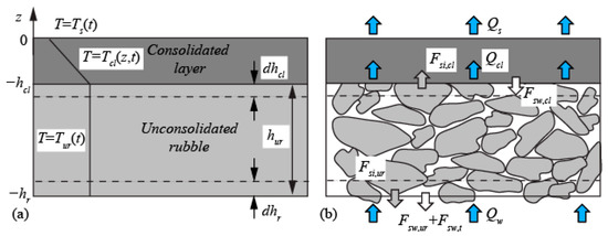 For the construction of a mathematical model describing the thermodynamic consolidation of ice ridges the following assumptions about the structure of their keels are made. The ridge keel consists of a consolidated layer (CL) in the upper part of the keel and unconsolidated rubble (UR) below CL (Figure 15a). Volumetric portion of water in UR is characterized by the macro-porosity . Macro-porosity of CL equals zero. The thicknesses of CL and UR are denoted as and , respectively. Thermal inertia is ignored inside CL, and the temperature profile in CL changes linearly from the surface temperature at to the bottom temperature at (Figure 15a). According to the thermodynamic equilibrium, the UR temperature equals the freezing point of seawater inside UR, where is the water salinity. The salinity of sea water inside UR and the salinity of brine inside submerged ice chunks inside UR are the same. The temperature and water salinity depend on time but are constant over the UR thickness (Figure 15a).