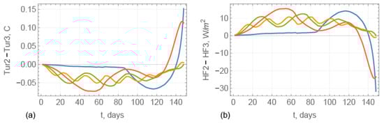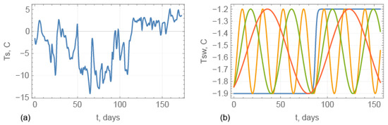 where the temperature is given in C. Figure 15b shows the graphs of (blue), (yellow), (green), and (red). These dependencies describe different types of changes of sea water temperature below UR along the ice ridge drift between the regions of Arctic water at −1.9 °C and Atlantic water at −1.2 °C (Figure 9, Figure 10, Figure 11 and Figure 12). The blue line in Figure 15b corresponds to a single crossing of the Polar Front by the ridge drifting from the Arctic water region to Atlantic water region. Yellow, green, and orange lines in Figure 16b correspond to multiple crossings of the Polar Front by the ridge.