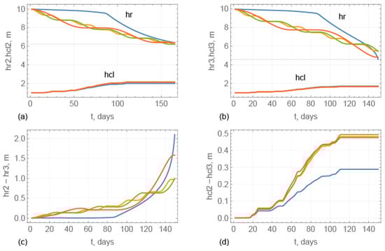 The results of numerical simulations are shown in Figure 16, Figure 17, Figure 18 and Figure 19. Symbols hcl2 and hcl3 designate, respectively, CL thicknesses calculated with the initial macro-porosities 0.2 and 0.3. Similar designations are used for ice rubble drafts (hr2 and hr3), UR macro-porosities (p2 and p3), UR temperatures (Tur2 and Tur 3), and the heat fluxes from the ocean at the bottom of UR (HF2 and HF3). Colors of the lines in Figure 16, Figure 17, Figure 18 and Figure 19 correspond to the line colors in Figure 16b.