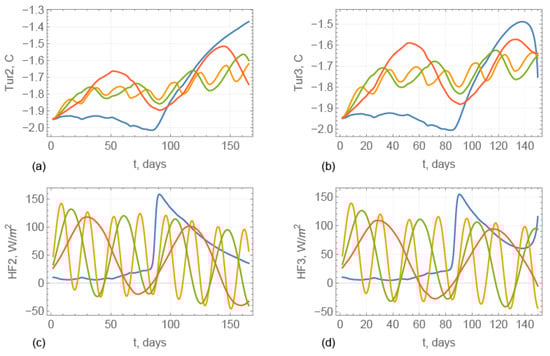 Figure 19 shows temporal evolution of the UR temperature (a,b) and the heat fluxes from the ocean to the bottom of UR (c,d). Temperature variations correspond to the changes of sea water temperature specified by Formula (21). Figure 16b and Figure 19c,d show that the heat fluxes increase with increasing of the sea water temperature below UR. Similar effects are visible in Figure 12. The UR temperature changes between −1.95 °C and −1.5 °C when the initial macro-porosity of UR is 0.2, and the surface temperature equals , , or . The UR temperature changes between −1.95 °C and −1.6 °C when the initial macro-porosity is 0.3, and the surface temperature equals , , or .