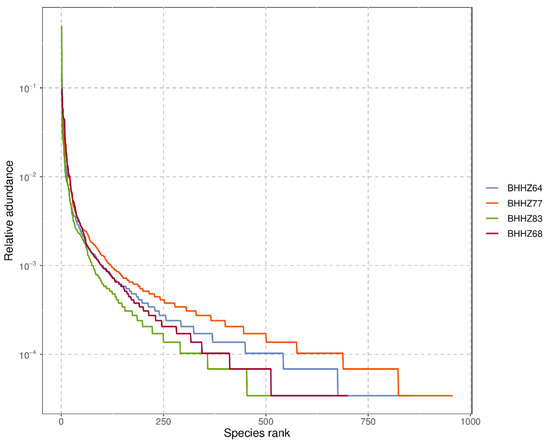 In community ecology, alpha diversity focuses on single-sample diversity analysis, which reflects the number of species in the microbial community. This method estimates species abundance and diversity by analyzing a series of statistical indexes. The large Chao1 index and observed species index represent high microbial community richness [30], and a high Shannon index represents high diversity [31]. A rank abundance curve can be used to explain species abundance and evenness of sample diversity. The abundance of species is reflected by the length of the curve along the horizontal axis. A wide curve represents rich species composition. The uniformity of species composition is reflected by the shape of the curve; a flatter curve represents more uniformity of species composition. As shown in Table 3, the largest CHAO1 index, observed species index, and largest Shannon index were detected in BHHZ77, indicating that community richness and diversity were highest in the Liao River estuary. Figure 2 shows that the sediment collected in the Liao River estuary (BHHZ 77) had the most uniformity and the richest species. Most of the nutrient concentrations around the Liao River estuary, except silicate and ammonia, were higher than in the other areas (Table 2), suggesting that the degree of pollution in the Liao River estuary was the highest of all the study areas. The community richness and diversity in the hypoxic zone (BHHZ83) were the lowest of all areas, even though high concentrations of nitrate and silicate were detected. Overall, the obvious differences in environmental factors might contribute significantly to variations in the microbial community, which will be discussed in detail later.