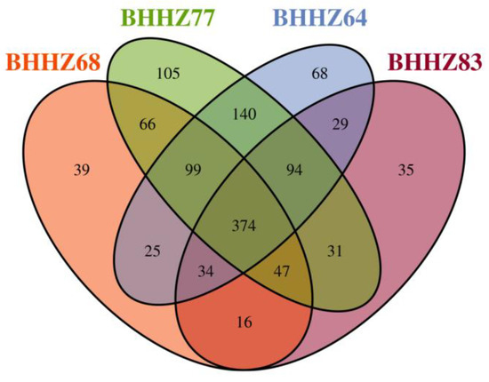 In community ecology, the beta diversity index focuses on the comparison of diversity between different habitats. Downstream analyses were conducted for each sample. A total of 956 (BHHZ77), 919 (BHHZ64), 741 (BHHZ68), and 722 (BHHZ83) OTUs were obtained. A Venn diagram of microbial communities in different sediments is shown in Figure 3. Other studies [32,33] have reported that a significant regional difference with a random distribution or environmental selection will result in different microbial structures, which was also true in this study. Due to the different environmental conditions, the number of shared OTUs sequences was small, and the diversities of sedimentary microorganisms were obvious different. The unique sequence number of OTUs was: BHHZ77 > BHHZ64 > BHH68 > BHHZ83, indicating that the amount of unique diversity in the Liao River estuary was the largest among the other zones or estuaries.