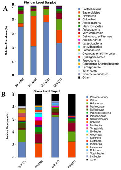 The dominant bacterial genera in four groups of samples were different from each other (Figure 4B and Figure 5). The genus Gillisia was dominant in the estuaries of the Bohai Sea, with a relative abundance of 16.34% in the Liao River estuary and 19.21% in the Yellow River estuary. Halomonas (10.53%), Marinobacter (8.8%), Paenisporosarcina (3.04%), and Pseudomonas (1.47%) were the other dominant genera in the Liao River estuary. Marinobacter (12.62%), Sulfitobacter (3.62%), Paenisporosarcina (6.51%), Salinimicrobium (6.00%), Maribacter (4.69%), and Pseudomonas (3.43%) were the other dominant genera in the Yellow River estuary. The offshore zone and hypoxic zone were both dominated by Photobacterium (18.02% and 51.78%, respectively). In the hypoxic zone, the dominant genera also included Sulfitobacter (4.52%), Marinobacter (3.57%), Halomonas (1.91%), Colwellia (1.11%), Maribacter (0.80%), and Salinimicrobium (0.79%). Halomonas (14.77%), Sulfitobacter (6.49%), Colwellia (4.57%), and Pseudomonas (1.41%) were the other dominant genera in the offshore zone. The dark column in Figure 4 represents the relative abundance of sequences that did not belong to any known classification hierarchy, indicating the presence of unidentified microorganisms in the area. The relative abundance of unknown genera was highest in BHZZ77, followed by BHZZ64, BHZZ68, and BHZZ83 (Figure 5). This suggests that the environmental parameters significantly affected the structure and diversity of microbial communities, which has been confirmed by other reports [41,42].