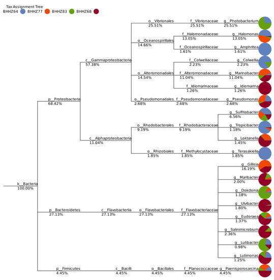 Twenty-four phyla of bacteria were detected in four groups of samples from different stations in the Bohai Sea. The dominant bacterial phyla in each group of samples were similar, but the relative abundance varied. The analysis results showed that the phyla Proteobacteria, Bacteroidetes, Firmicutes, Chloroflexi, Actinobacteria, Planctomycetes, Acidobacteria, and Verrucomicrobia were dominant in all samples. According to the literature, Proteobacteria, Firmicutes, Actinobacteria, and Bacteroidetes are the main phyla of denitrifying bacteria [34,35]. Bacteroidetes and Actinobacteria are able to degrade organic pollutants [36,37]. Actinobacteria can promote the decomposition of the remains of animals and plants to complete the mineralization of organics in the sediment [38]. Bacteroidetes, which are found mainly in anoxic environments, can not only hydrolyze macromolecules but also promote the transformation of nitrogenous substances [39]. In addition to the above phyla, Planctomycetes, Acidobacteria, and Verrucomicrobia were also commonly found in the Bohai Sea [33]. Chloroflexi plays an important role in the hydrolysis of proteins and polysaccharides [40]. From the above functional analysis results, we demonstrated that organics were the main pollutants in the Bohai sea. As shown in Figure 4, Proteobacteria was the dominant phylum type in three areas, namely, the Liao River estuary (station BHHZ77, 46.26%), the hypoxic zone (station BHHZ83, 76.19%), and the offshore zone (station BHHZ64, 69.79%), while the dominant phylum in the Yellow River estuary (station BHHZ68 station) was Bacteroidetes. Bacteroidetes had the largest relative abundance (43.31%), followed by Proteobacteria (41.37%). All of the relative abundances of Firmicutes, Chloroflexi, Actinobacteria, Planctomycetes, and Acidobacteria in the Liao River estuary (station BHHZ77) were higher than in the Yellow River estuary, hypoxic zone, or offshore zone. Lentisphaerae, Candidatus, and Saccharibacteria were detected only at stations BHHZ77 and BHHZ64. Armatimonadetes and Deferribacteres were detected only at station BHHZ77, and Spirochaetes and Chlamydiae were found only at station BHHZ64. Gemmatimonadetes and Parcubacteria were not detected in the BHHZ68 station, and Tenericutes and Fusobacteria were not found in the sediments of BHHZ64 and BHHZ83. In summary, we demonstrated that the microbial community was different at each of the four stations, which could be the result of different environmental parameters. The effects of environmental parameters on the microbial community will be analyzed in the next section.