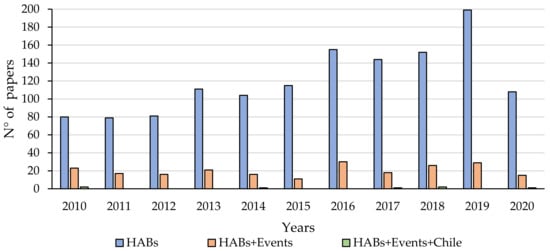 Number of papers associated with the keywords HABs and the combinations of HABs + Events and HABs + Events + Chile.