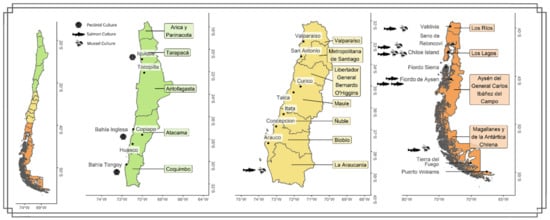 Map of Chilean political regions showing main aquaculture activities: Pectinids (Argopecten purpuratus), Mytilids (Mytilus chilensis), and Salmonids (Oncorhynchus kisutch, Oncorhynchus mykiss, Salmo salar).